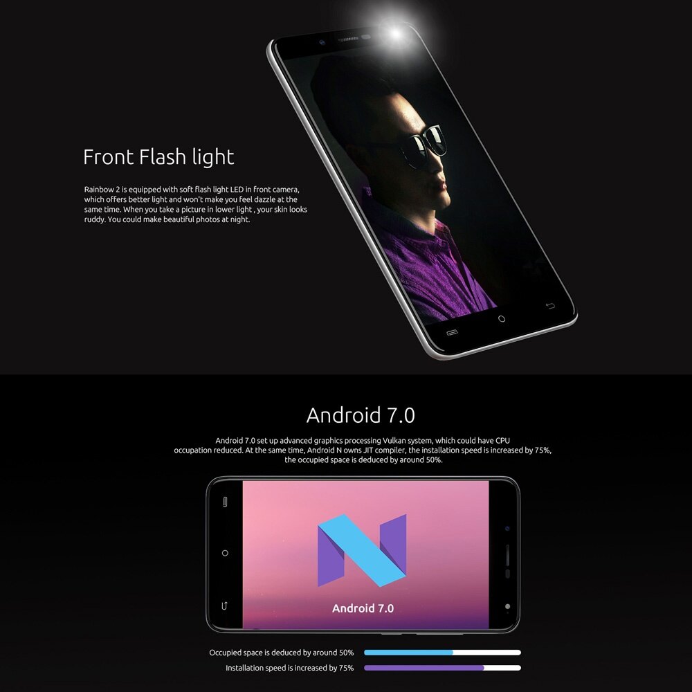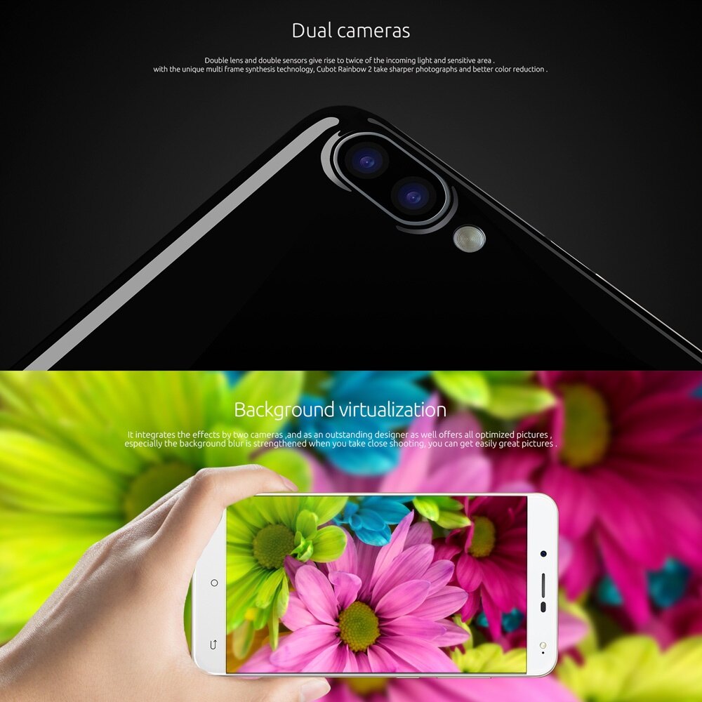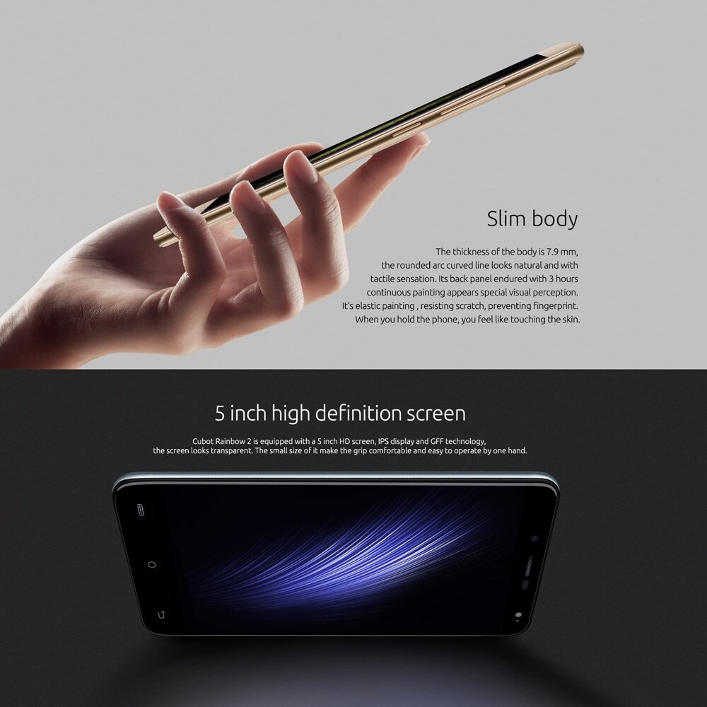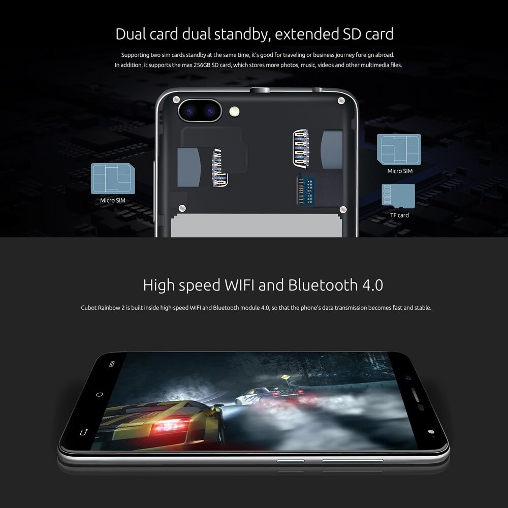 Cubot Rainbow 2 is equipped with a 5.0inch HD screen, IPS display and GFF technology. Supporting two SIM cards standby at the same time, it's good for traveling or business journey foreign abroad, in addition, it supports the max 256GB SD card, which stores more photos, music, videos and other multimedia files.
