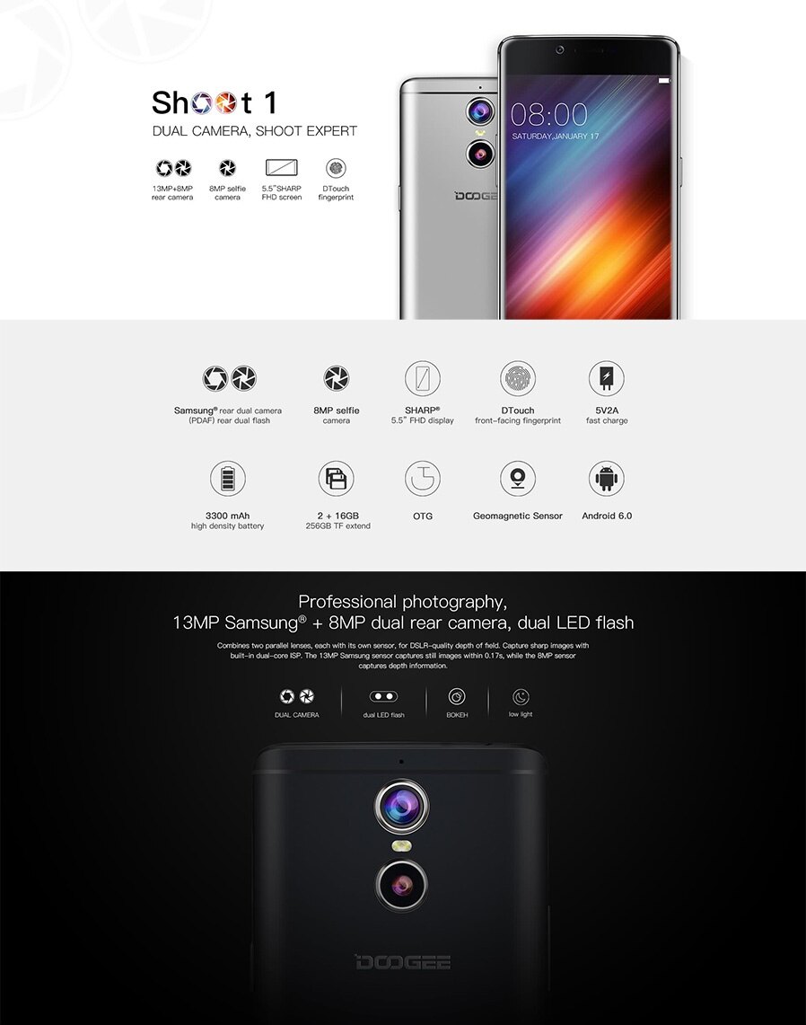 Product details of DOOGEE Shoot 1 5.5" FHD Android 6.0 4G Phone w/ 2GB RAM, 16GB ROM