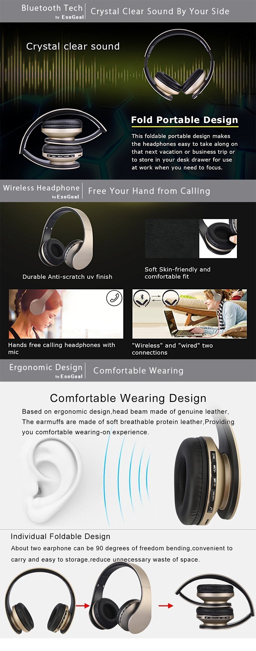 Spesifikasi Esogoal Wireless Bluetooth Headphone Foldable Headset Noise Isolation Over Ear Earphone with Mic, (Gold+Black)