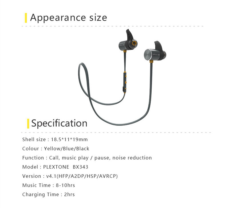 Spesifikasi PLEXTONE BX343 Waterpoof Bluetooth Headset Wireless Sport Running Headphones Handsfree Earbuds Magnetic Sport Earphones with Microphone for Moblie Phone(Black Blue Yellow)